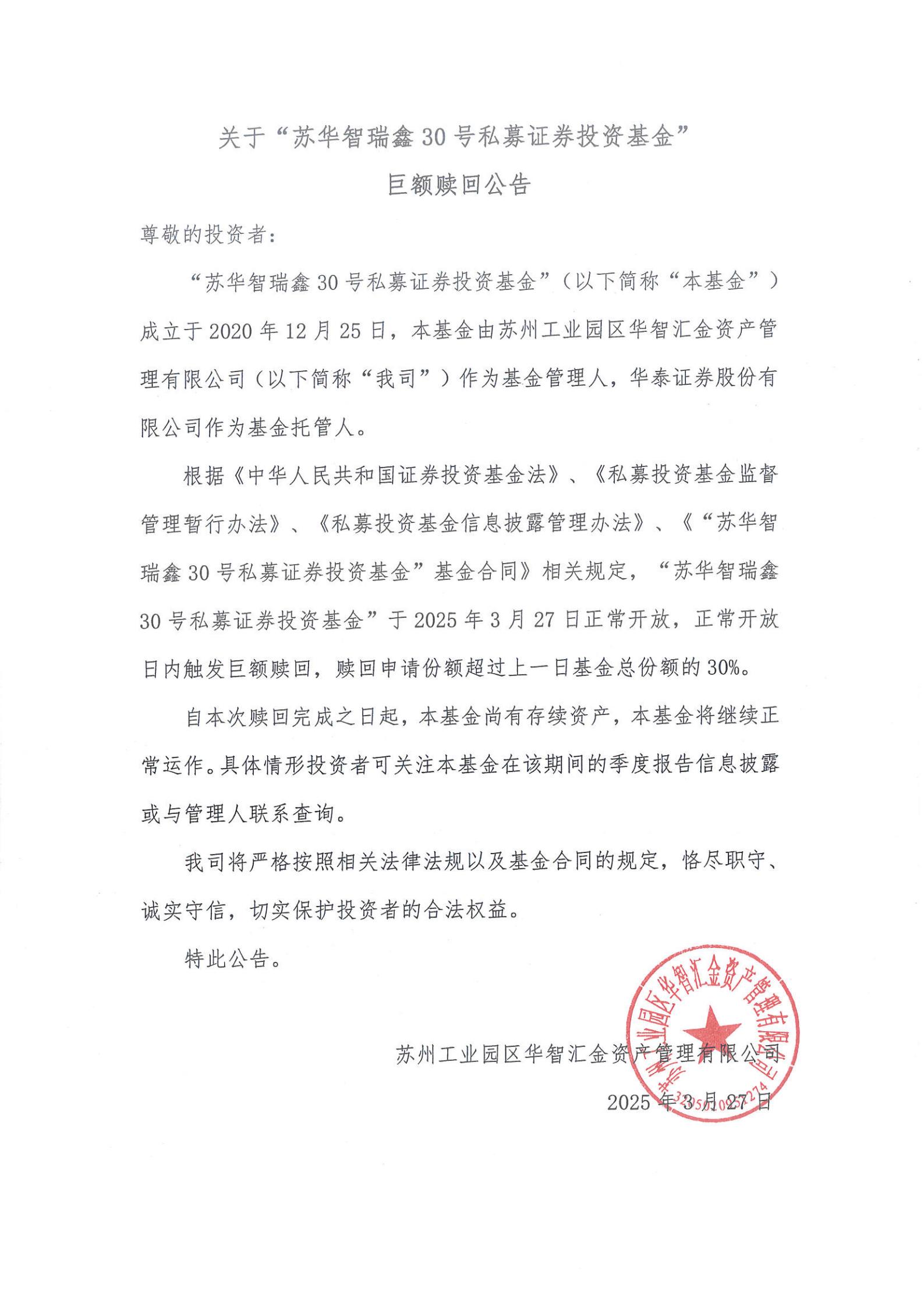 关于“苏华智瑞鑫30号私募证券投资基金”巨额赎回公告